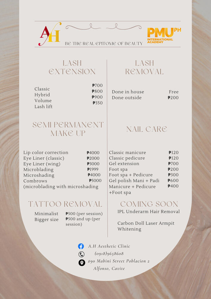 A.H Aesthetic Clinic is a clinic that was established by Aiko L. Herrera in the year of 2021. This clinic offers a variety of services such as lash extensions, semi-permanent make-ups, manicure/pedicure, and etc.A.H Aesthetic aims to provide a high standard beauty services to their clients to help boost their confidence.A.H Aesthetic Clinic is entirely dedicated to upholding high standards, not only in the services they offer to their clients, but also in the products that they supply and how they conduct business.